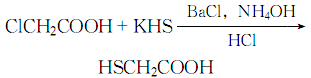 3.攪拌下將16%的氯乙酸水溶液與15%的硫氫化鉀水溶液混合,ClCH2COOH∶KHS=1∶ 2( 摩爾比) 。加熱,加入與氯乙酸相同物質量的氯化鋇飽和溶液,然后加入25%的濃氨水,攪拌均勻后,靜置,過濾,濾液中加入等體積的濃鹽酸,再用乙醚萃取,蒸餾除去乙醚,后,在2000Pa蒸餾,收集104~106℃餾分,即得成品硫代乙醇酸。