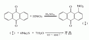 1.硝化還原法 蒽醌經(jīng)混酸硝化得硝基蒽醌,反應(yīng)產(chǎn)物過(guò)濾并用熱水洗至中性后,用亞硫酸鈉精制。其中2-硝基蒽醌與亞硫酸鈉生成易溶于水的蒽醌-2-磺酸鈉,過(guò)濾后洗滌除去之。所得1-硝基蒽醌用硫化鈉還原得1-氨基蒽醌粗品,經(jīng)加堿液、保險(xiǎn)粉精制除去二氨基蒽醌后再用氧氣氧化、過(guò)濾、干燥,得成品。