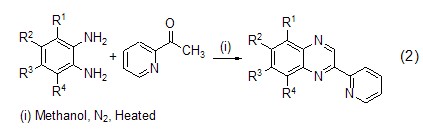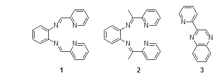 鄰苯二胺與2-吡啶甲醛反應時得到的是N4席夫堿配體1[1],但是當把2-吡啶甲醛換成2-乙酰基吡啶時,以氯甲酸甲酯為催化劑,在異丙醇中反應沒有得到相應的N4席夫堿配體2,而是得到了苯并六元環產物即2-(2′-吡啶基)喹喔啉3[2]。