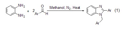 鄰苯二胺和兩當量的芳香醛在甲醇中反應時,生成相應的五元氮雜環的苯并咪唑衍生物 (式1)[3]。