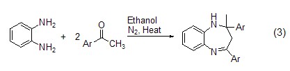 改變反應方法,在微波輻射下鄰苯二胺及其衍生物與乙酰基芳香族化合物也可以得到苯并氮雜 化合物 (式4)。